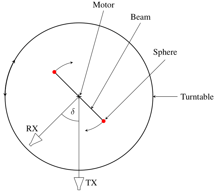In [1], Schwind presents a detailed description of the measurement setup and some initial delay-Doppler parameter estimation results. In essence, two metallic spheres are mounted on a metal rod attached to a motor. The bistatic measurement angle \(\delta\) spans between the transmitter (TX), the motor, and the receiver (RX). In the dataset, this angle varies in ten-degree increments. As a result, the channel measurements include forward \((\delta \approx 180^\circ)\), backward \((\delta \approx 0^\circ)\), and bistatic scattering scenarios. Below you can find a schematic drawing of the setup.